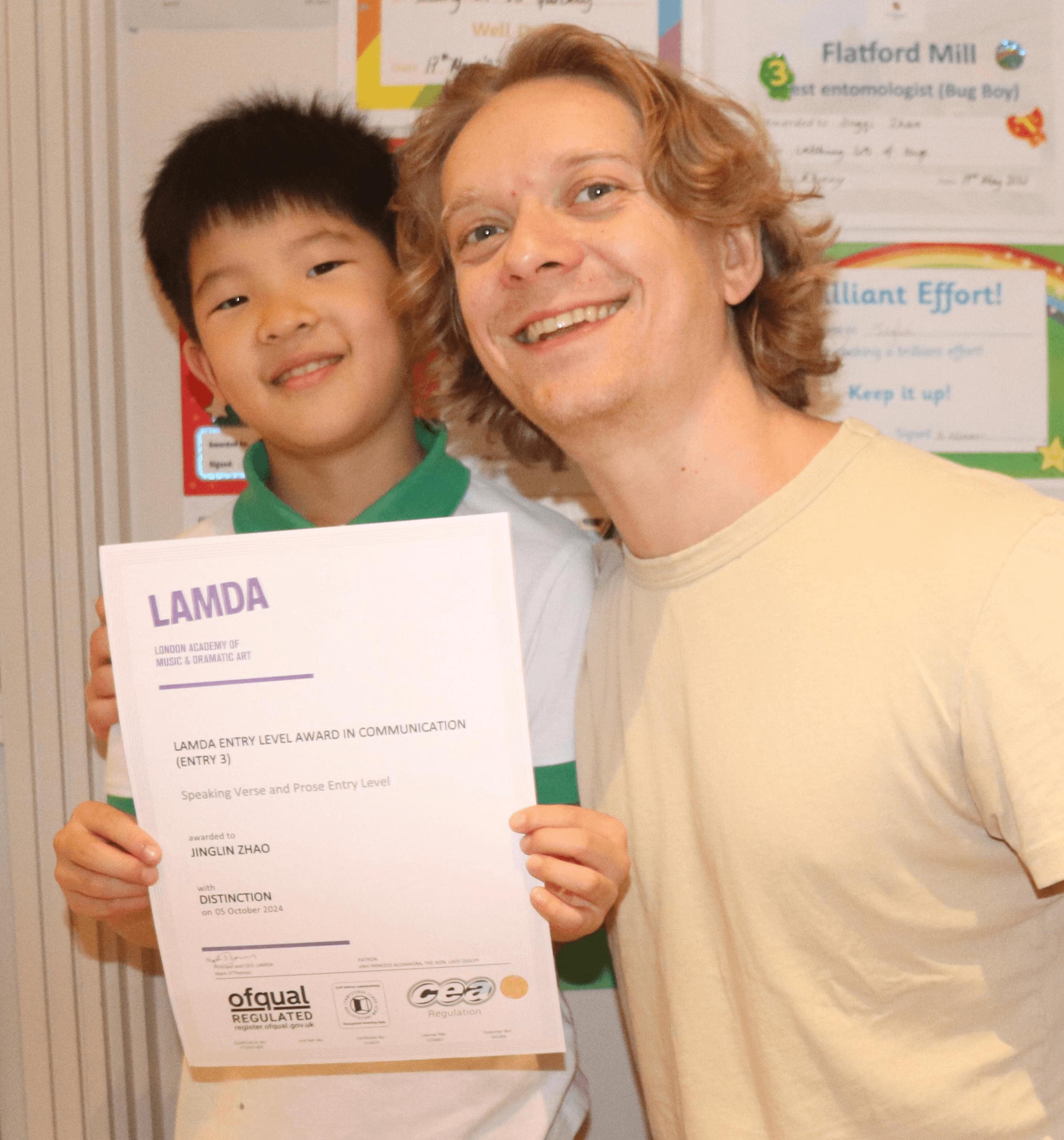 JingLin, one of our students, proudly poses with his tutor, Jimmy, holding his LAMDA, scoring a distinction. Congratulations, JingLin!